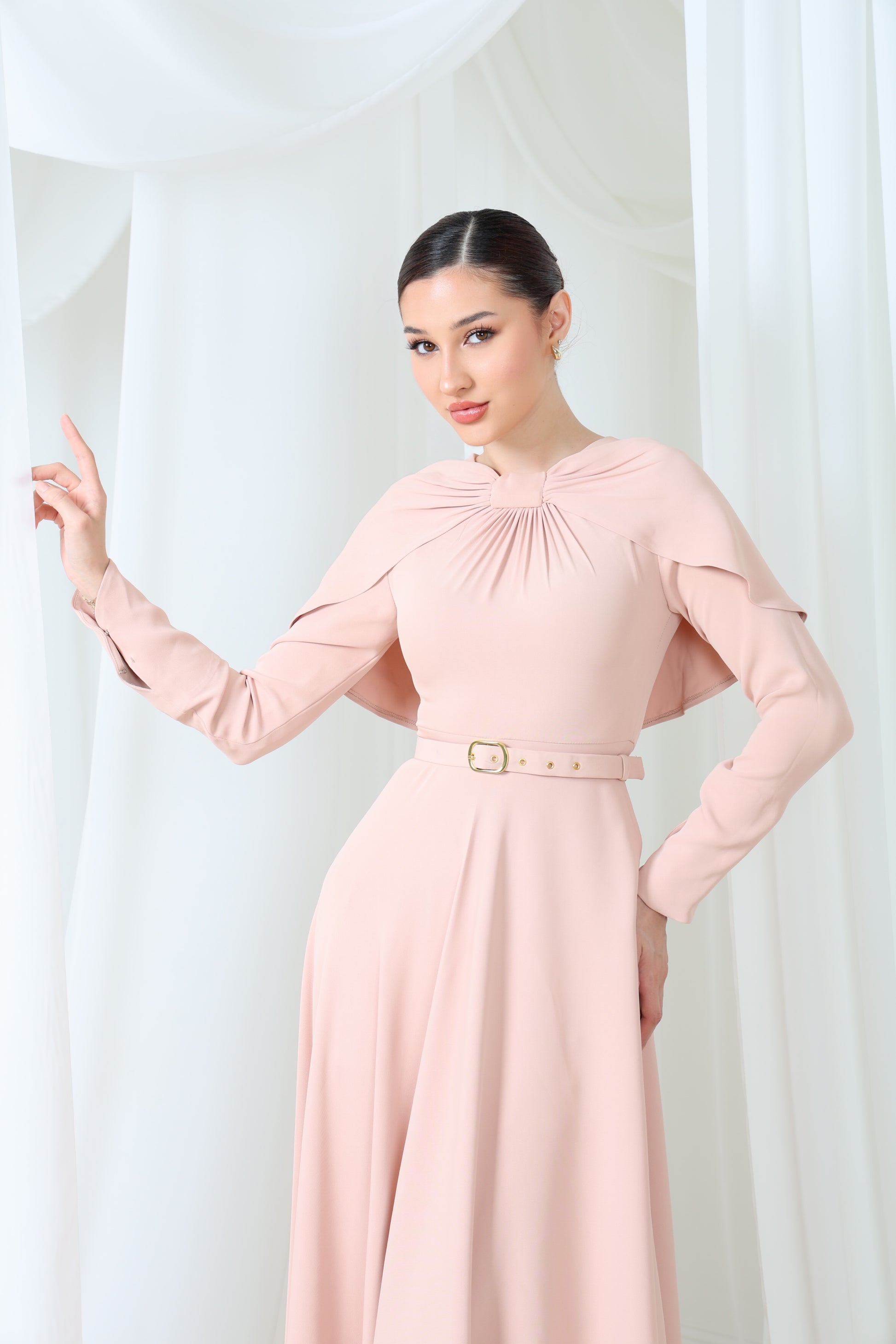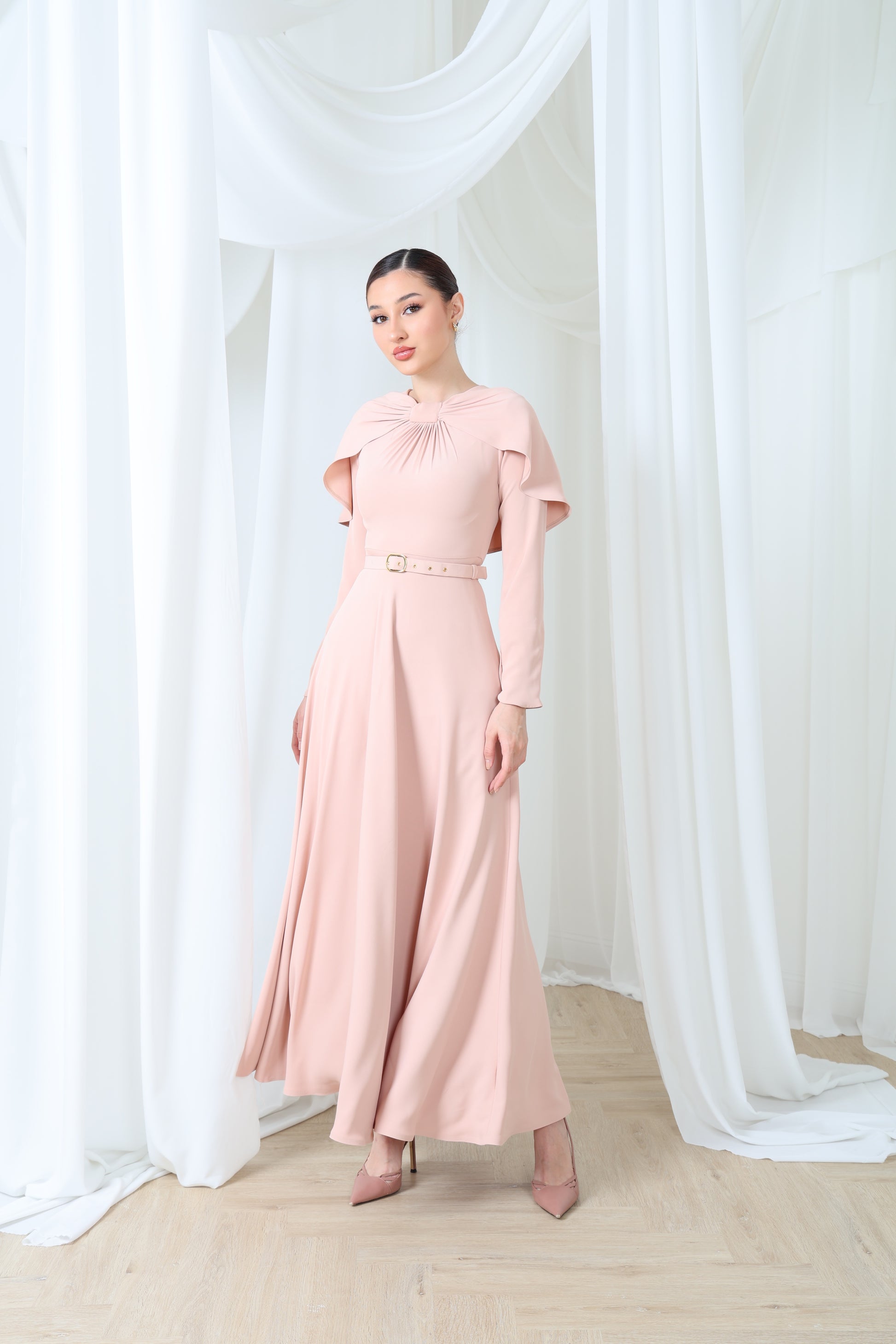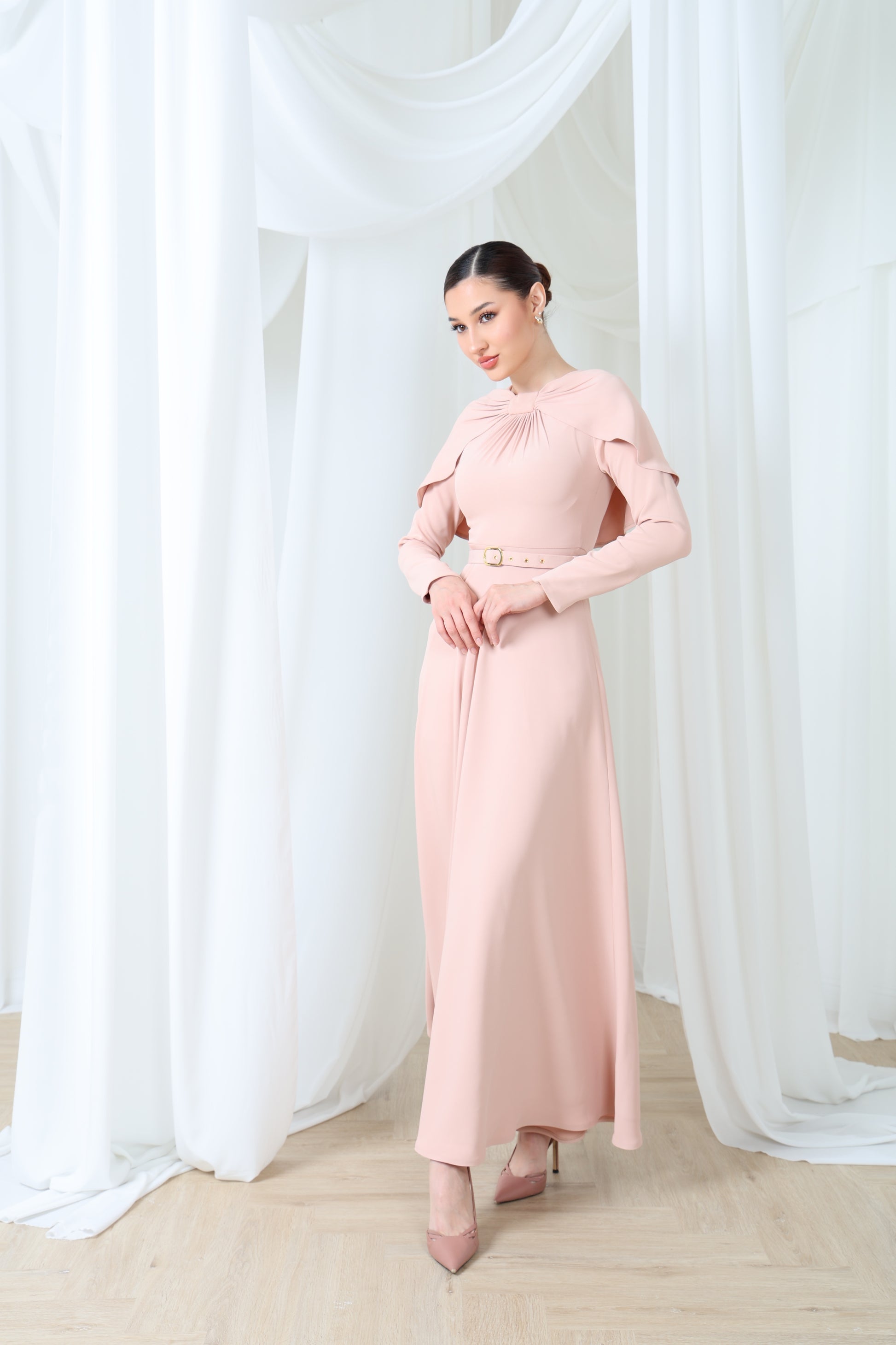 انطلقي في أجواء من الفخامة الهادئة مع فستان روزوود غريس - قطعة أنيقة وانسيابية بلون وردي باهت، تتميز بتفاصيلها الرقيقة على شكل كابيليه تتدلى برقة على الكتفين. يضفي خط العنق المتجمع أناقةً نحتية، بينما يُضفي حزام الخصر المُصمم بدقة تحديدًا دقيقًا. مصنوع من قماش ساتان بثنيات انسيابية، يُجسد هذا الفستان الأنوثة العصرية مع لمسة من الأناقة الخالدة.
