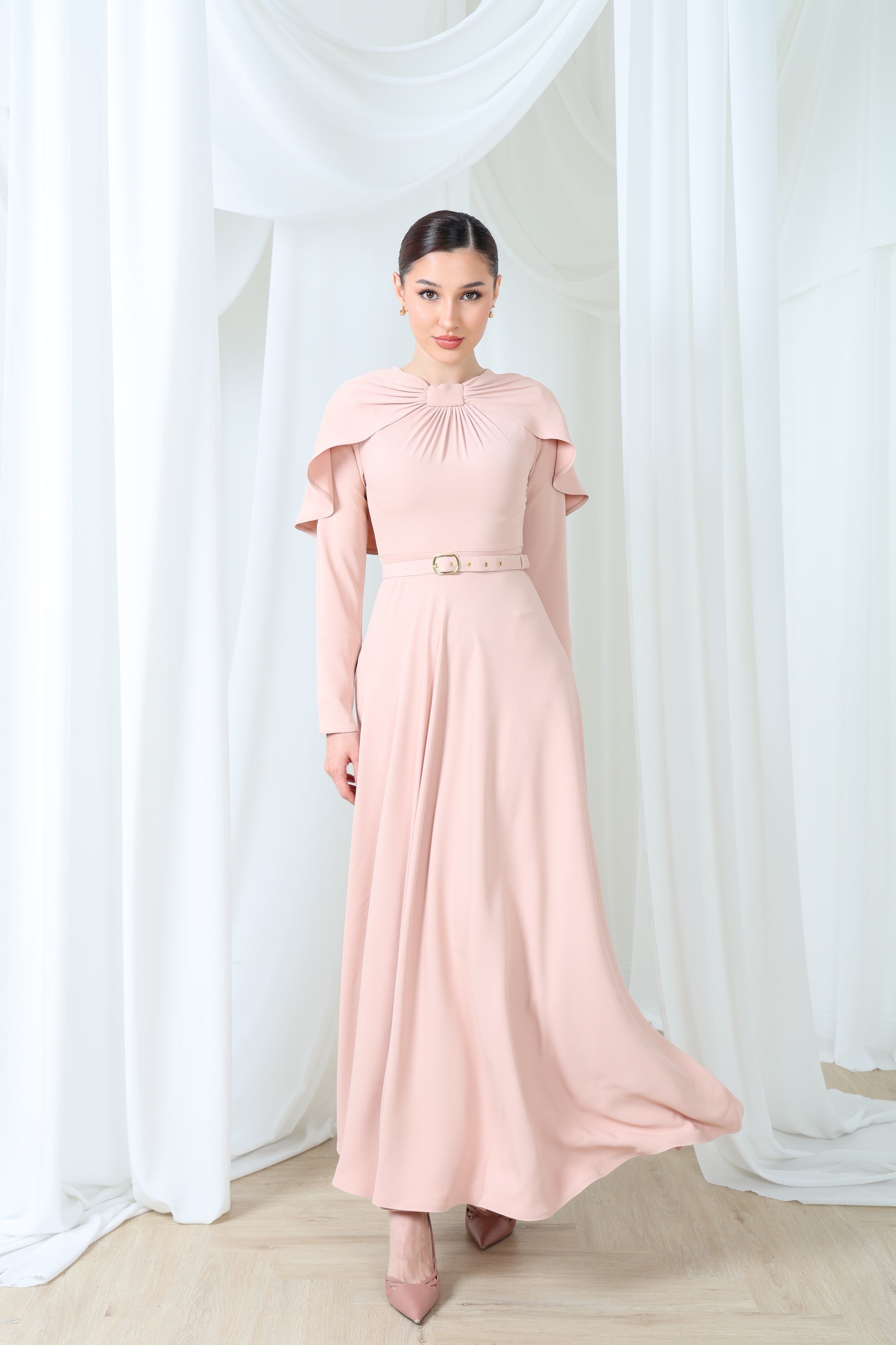Step into quiet luxury with our Rosewood Grace dress — a flowing statement piece in blush rose, defined by its ethereal capelet detail that cascades gently over the shoulders. The gathered neckline adds a sculptural elegance, while the tailored waist belt creates subtle definition. Crafted from a satin-like fabric with a fluid drape, this dress embodies modern femininity with a nod to timeless grace.